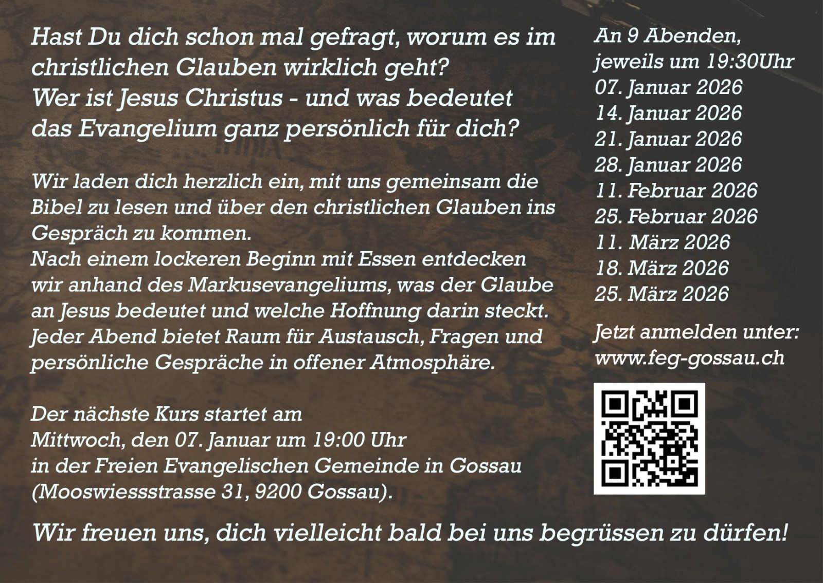 Wir laden dich herzlich ein, mit uns gemeinsam die Bibel zu lesen und über den christliche Glauben ins Gespräch zu kommen.