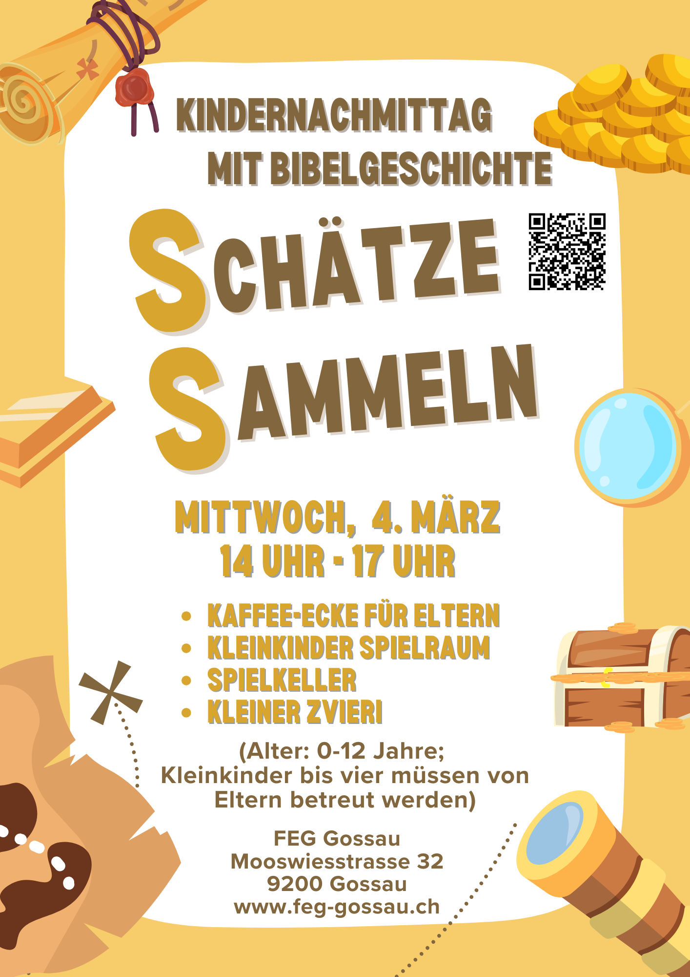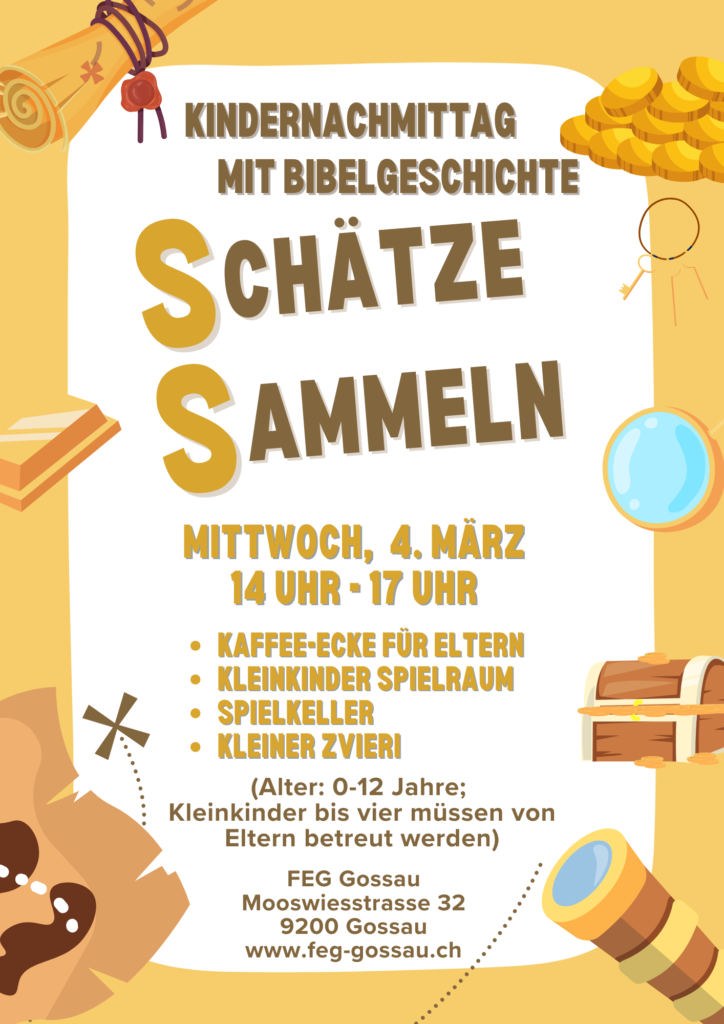 Am Mittwoch, den 4. März von 14 Uhr – 17 Uhr findet der Kindernachmittag mit dem Thema „Schätze sammeln“ statt. An diesem Nachmittag wird es verschiedene Aktivitäten geben, bei welchen Teile des persönlichen Schatzes gewonnen werden können. Zwischendrin gibt es einen kleinen Zvieri und eine passende biblische Geschichte. Herzliche Einladung!
